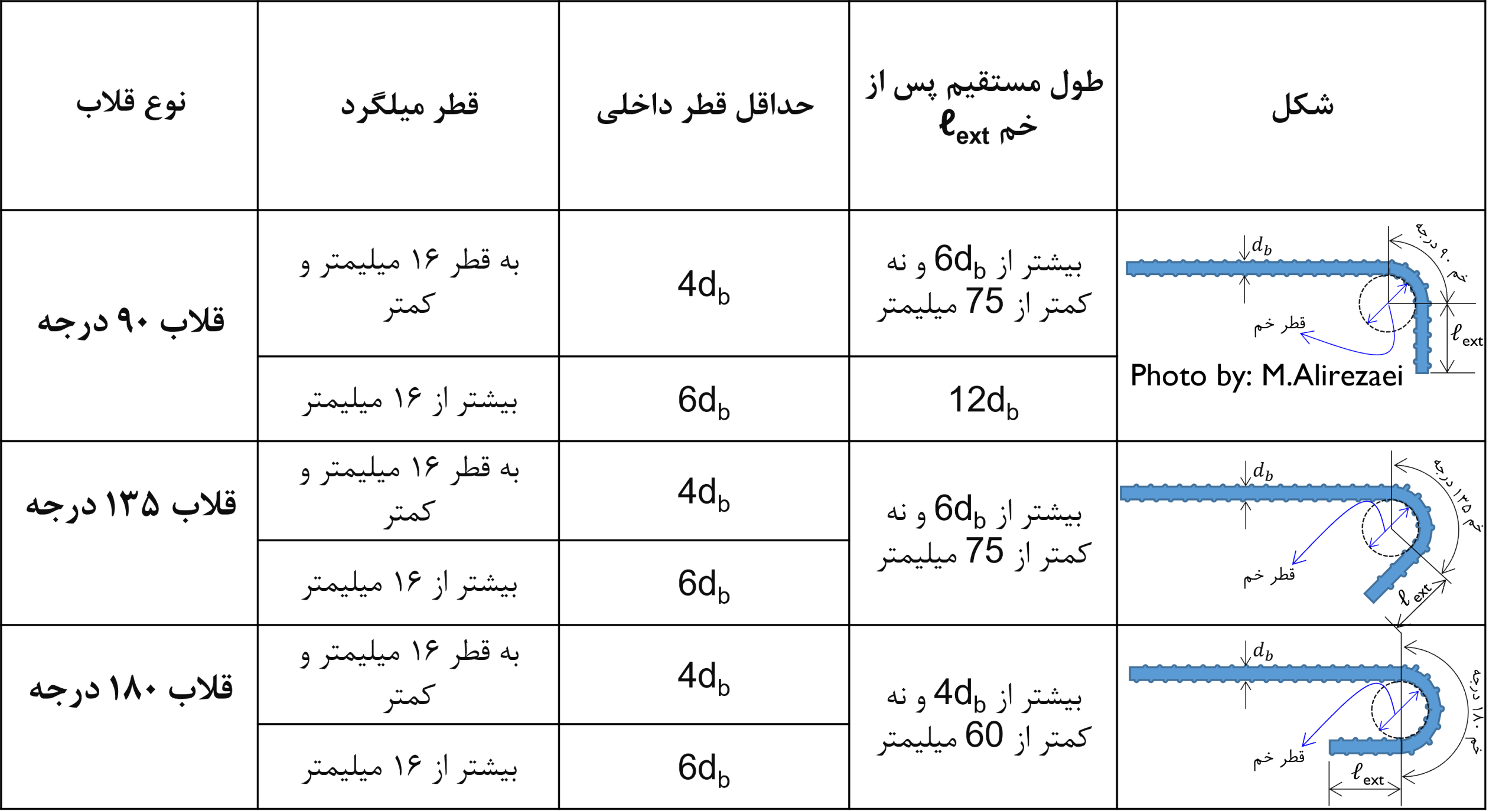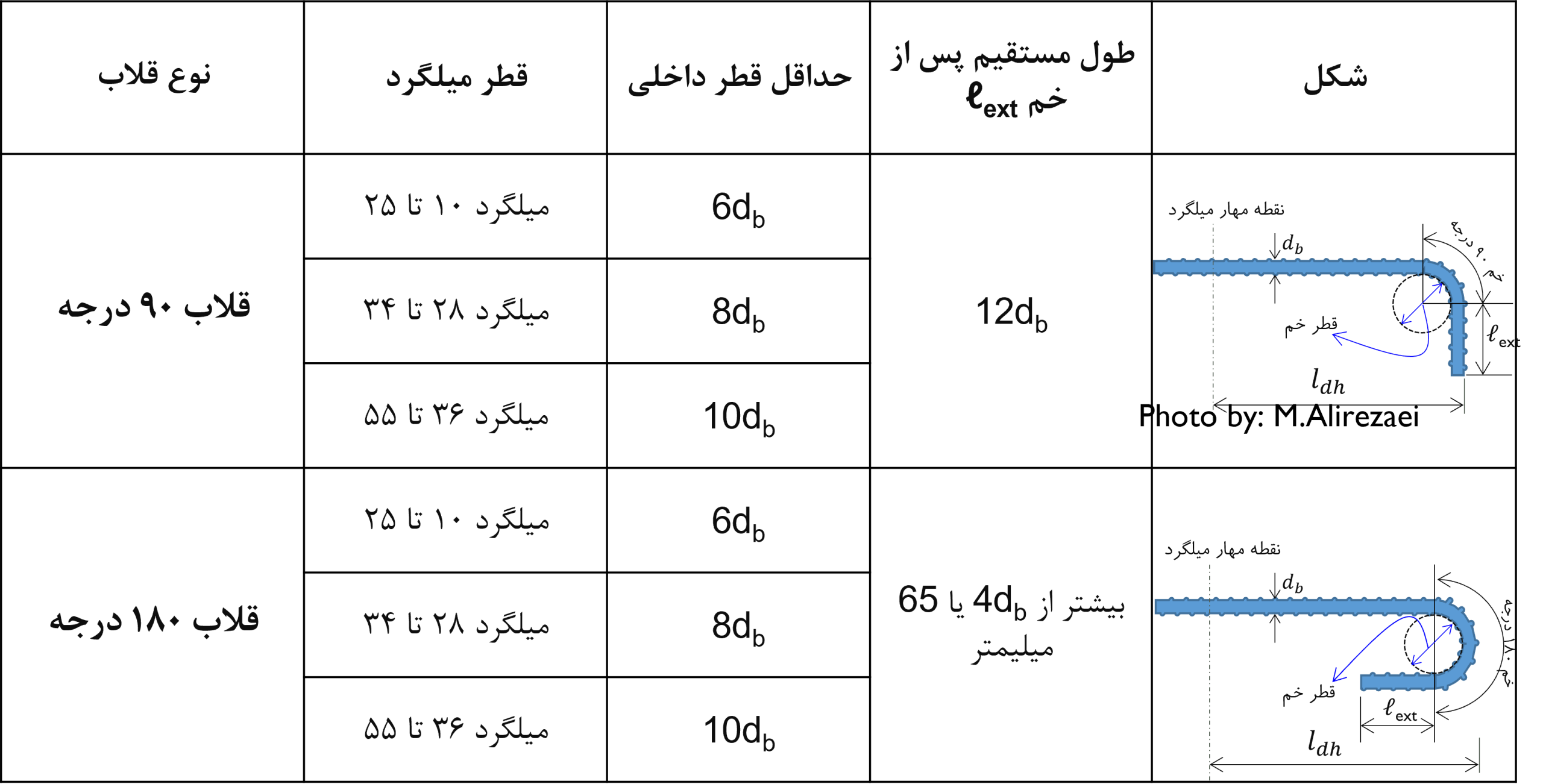 – خم 90 درجه (گونیا) به اضافه حداقل 6db به طول مستقیم ولی نه کمتر از 75 میلیمتر در انتهای آزاد میلگرد، برای میلگردهای به قطر 16 میلیمتر و کمتر.